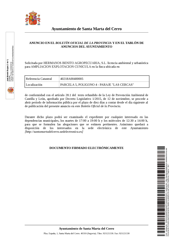 Solicitada por HERMANOS BENITO AGROPECUARIA, S.L. licencia ambiental y urbanística para AMPLIACION EXPLOTACION CUNICULA en la finca ubicada en Referencia Catastral 40218A00400005 Localización PARCELA 5, POLÍGONO 4 - PARAJE "LAS CERCAS".